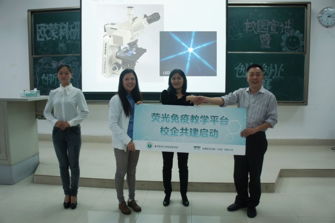 重慶醫科大學檢驗醫學院黨總支書記翁亞光教授、校實驗教學管理中心李革主任、歐蒙學院負責人盧潔女士就熒光免疫教學共建達成合作。