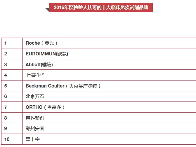 附《2016年度檢驗人認可的十大臨床免疫試劑品牌》名單: