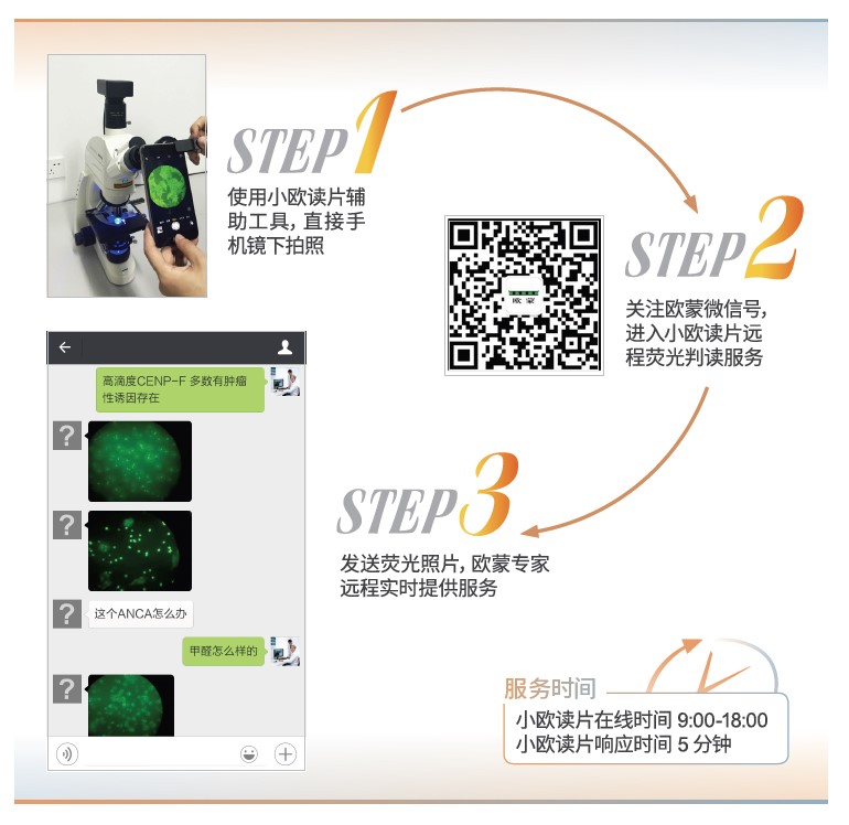 小歐讀片*:歐蒙技術團隊傾情打造云服務端小歐讀片,用戶只需通過手機拍照的形式向平臺發(fā)送圖片,即可獲得歐蒙專家團隊的及時服務,該平臺提供專業(yè)化、標準化的熒光核型疑難片遠程判讀服務,隨時隨地解決客戶難題。