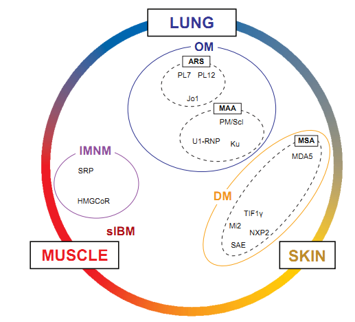 皮肌炎是一種主要累及橫紋肌,以淋巴細(xì)胞浸潤為主的非化膿性炎癥病變,可伴有或不伴有多種皮膚損害,常累及多種臟器。如累及呼吸肌可導(dǎo)致呼吸無力,排痰困難,肺部感染。最嚴(yán)重的并發(fā)癥是急進(jìn)型肺泡炎,表現(xiàn)為發(fā)熱、氣短、劇咳,快速進(jìn)展的呼吸困難,嚴(yán)重者可導(dǎo)致成人呼吸窘迫綜合征。此外,間質(zhì)性肺病(ILD)也是肌炎患者主要的致病和致死因素,ILD的發(fā)生與抗ARS抗體、抗MDA5抗體和抗PM-Scl抗體相關(guān)。檢測患者血清中的肌炎抗體譜,對于肌炎的臨床診斷非常重要,也可幫助新冠病毒肺炎進(jìn)行鑒別診斷。