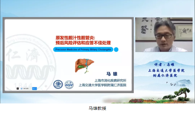 會(huì)議首先由我國(guó)權(quán)威肝臟病學(xué)、消化內(nèi)科專家,上海交通大學(xué)醫(yī)學(xué)院附屬仁濟(jì)醫(yī)院消化內(nèi)科主任馬雄教授在線上進(jìn)行了題為“原發(fā)性膽汁性膽管炎:預(yù)后風(fēng)險(xiǎn)評(píng)估和應(yīng)答不佳處理”相關(guān)的學(xué)術(shù)報(bào)告分享。馬雄教授主要從原發(fā)性膽汁性膽管炎疾病(PBC)切入,對(duì)PBC患者的臨床診斷、預(yù)后風(fēng)險(xiǎn)評(píng)估及藥物治療應(yīng)答不佳處理等方面進(jìn)行了深入的思考。其間也系統(tǒng)闡述了課題組在PBC相關(guān)易感因素、基因分型和腸道菌群等相關(guān)致病機(jī)制上的最新研究進(jìn)展。并對(duì)抗線粒體抗體AMA陽(yáng)性的病人在病理學(xué)上的一些改變做了詳細(xì)的介紹,強(qiáng)調(diào)對(duì)AMA抗體及肝臟生化指標(biāo)ALP等陽(yáng)性但未及時(shí)出現(xiàn)亞臨床表現(xiàn)的病人應(yīng)當(dāng)更加關(guān)注。馬雄教授的報(bào)告受到了與會(huì)專家的高度評(píng)價(jià),將對(duì)相關(guān)疾病的研究起到了積極的推動(dòng)作用。