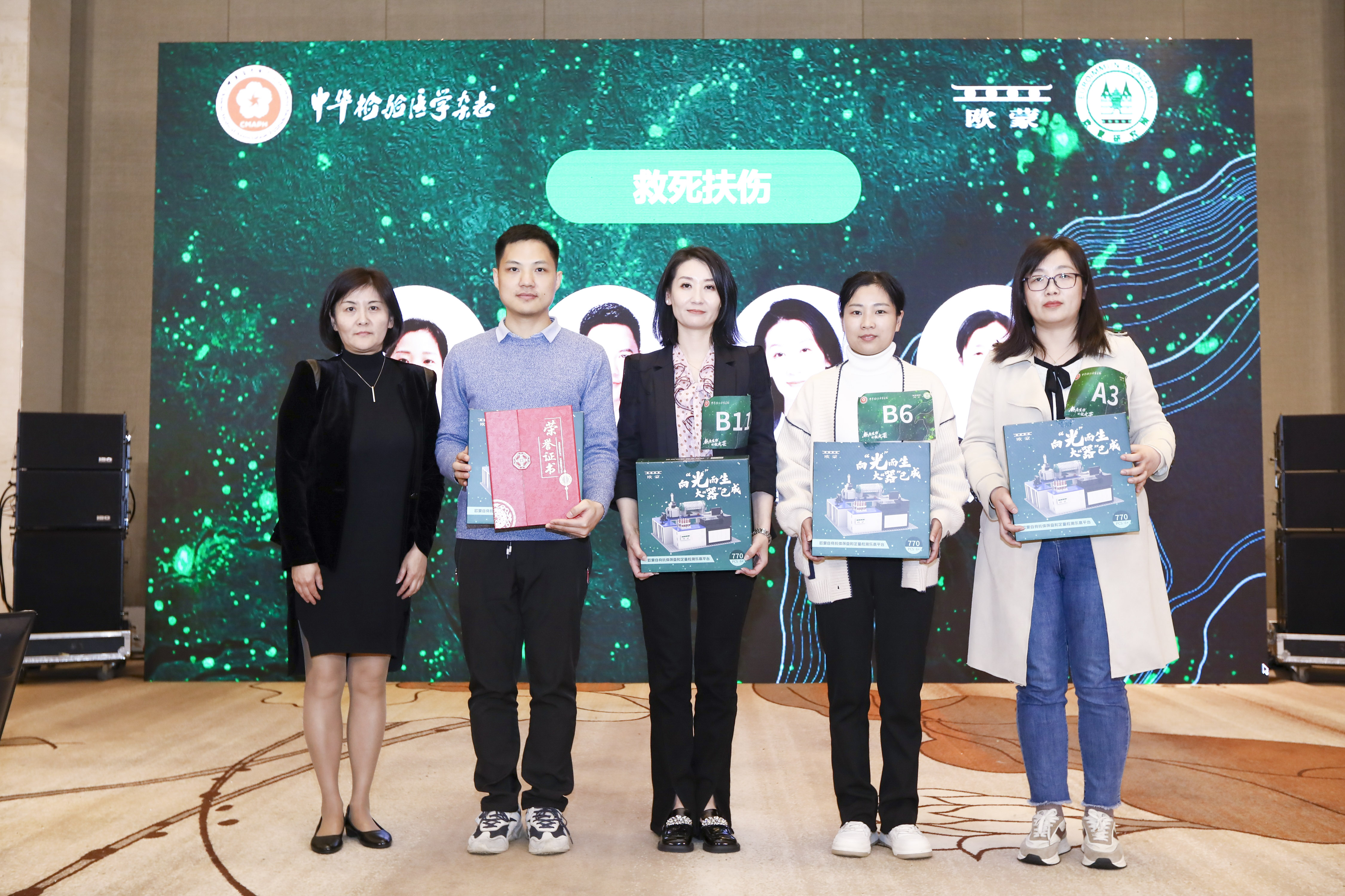 中日友好醫院曹永彤教授(左)、中南大學湘雅醫學院附屬長沙醫院伍勇教授(中)、《中華檢驗醫學雜志》編輯部唐棟老師(右)