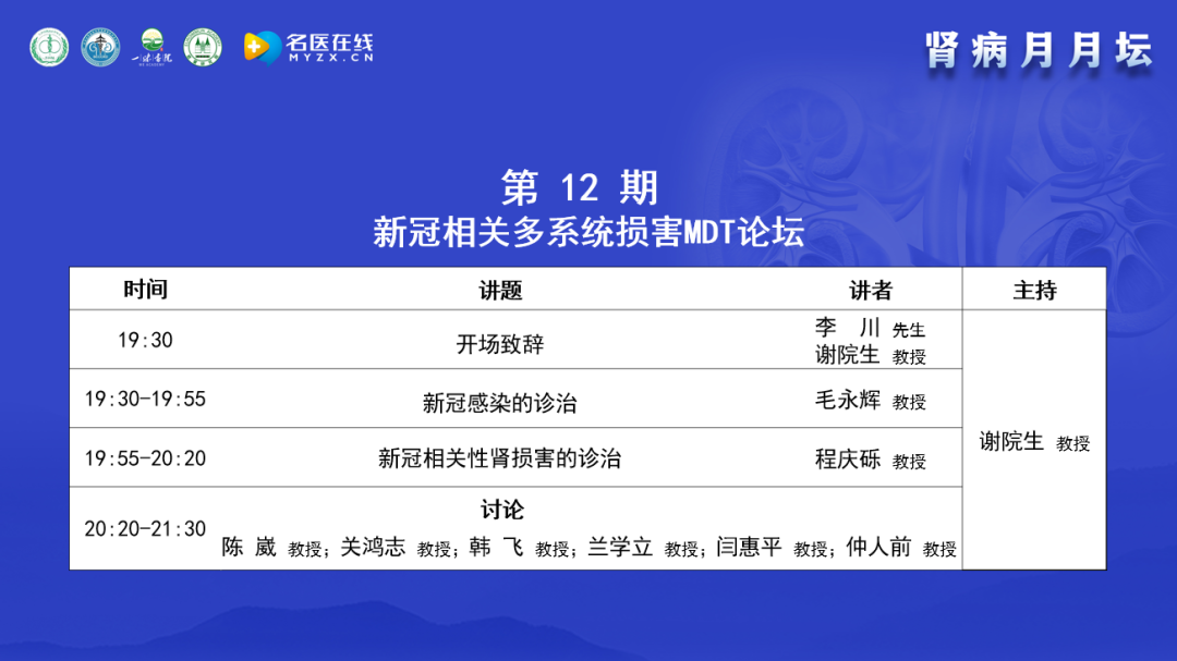 2023年4月11日,由北京中西醫(yī)結(jié)合學(xué)會腎臟病專業(yè)委員會舉辦的《腎病月月壇(第12期)——新冠相關(guān)多系統(tǒng)損害MDT論壇》于線上成功舉辦。本次論壇由北京中西醫(yī)結(jié)合學(xué)會腎臟病專業(yè)委員會主任委員、解放軍總醫(yī)院第一醫(yī)學(xué)中心謝院生教授擔(dān)任大會主席,歐蒙醫(yī)學(xué)診斷CEO,一味書院執(zhí)行院長、發(fā)起人李川先生作為致辭嘉賓,北京醫(yī)院毛永輝教授、解放軍總醫(yī)院第二醫(yī)學(xué)中心程慶礫教授作為講課嘉賓,中山大學(xué)附屬第一醫(yī)院陳崴教授、北京協(xié)和醫(yī)院關(guān)鴻志教授、浙江大學(xué)醫(yī)學(xué)院第一附屬醫(yī)院韓飛教授、北京大學(xué)航天臨床醫(yī)學(xué)院蘭學(xué)立教授、首都醫(yī)科大學(xué)附屬北京佑安醫(yī)院閆惠平教授以及上海長征醫(yī)院仲人前教授作為本次大會的討論嘉賓。