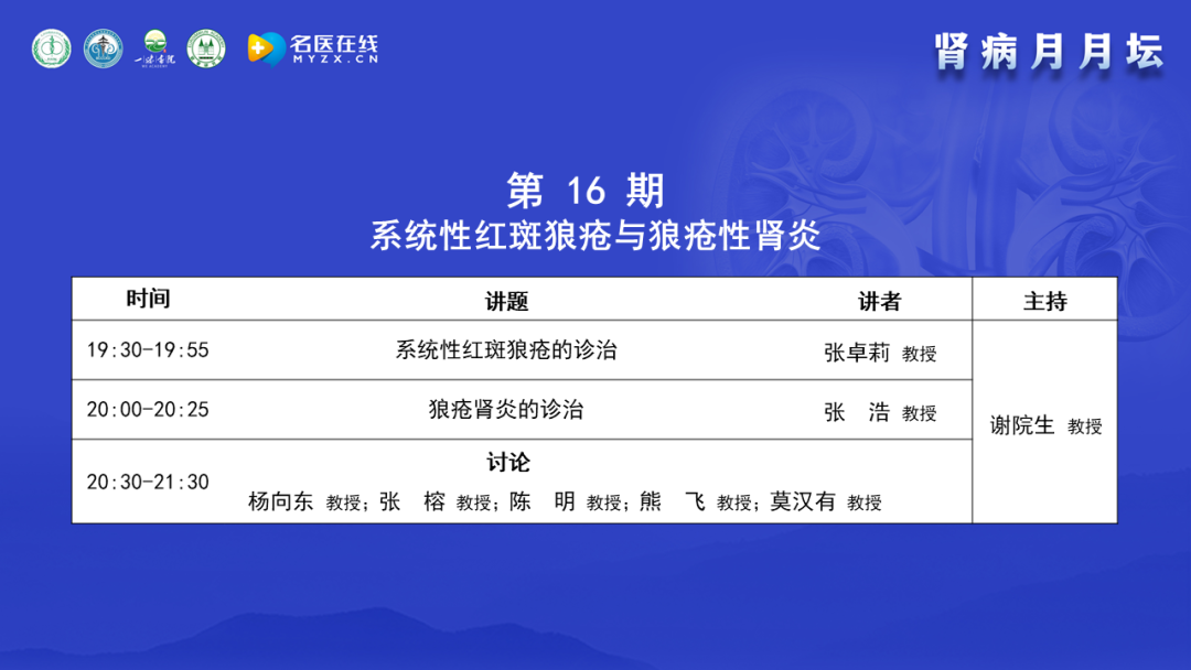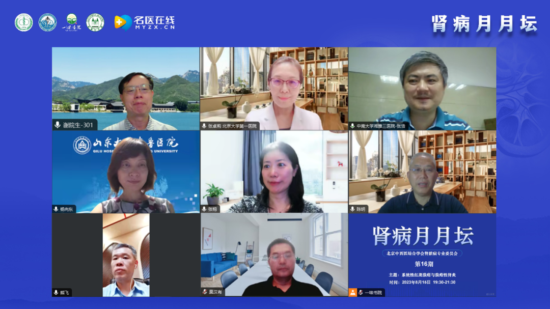 2023年8月15日,由北京中西醫(yī)結(jié)合學(xué)會腎臟病專業(yè)委員會舉辦的《腎病月月壇(第16期)——系統(tǒng)性紅斑狼瘡與狼瘡性腎炎》于線上成功舉行。本次論壇由北京中西醫(yī)結(jié)合學(xué)會腎臟病專業(yè)委員會主任委員、解放軍總醫(yī)院第一醫(yī)學(xué)中心謝院生教授擔(dān)任大會主席,北京大學(xué)第一醫(yī)院張卓莉教授、中南大學(xué)湘雅三醫(yī)院張浩教授作為講課嘉賓,山東大學(xué)齊魯醫(yī)院楊向東教授、中國醫(yī)科大學(xué)附屬第一醫(yī)院張榕教授、成都中醫(yī)藥大學(xué)附屬醫(yī)院陳明教授、武漢市第一醫(yī)院熊飛教授以及廣西醫(yī)科大學(xué)第一附屬醫(yī)院莫漢有教授作為本次大會的討論嘉賓。