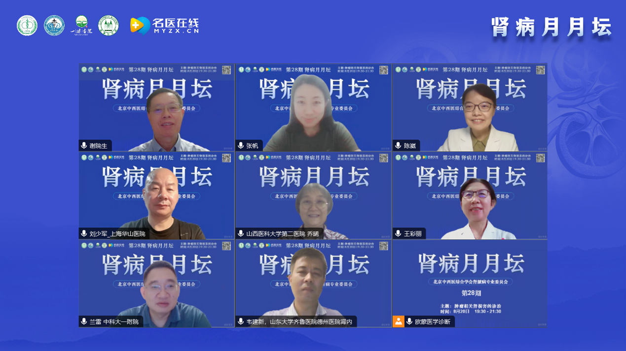 2024年8月20日,由北京中西醫(yī)結(jié)合學(xué)會腎臟病專業(yè)委員會舉辦的《腎病月月壇(第28期)——腫瘤相關(guān)腎損害的診治》于線上成功舉行。本次論壇由北京中西醫(yī)結(jié)合學(xué)會腎臟病專業(yè)委員會主任委員、北京中西醫(yī)結(jié)合腎臟疑難病會診中心主任、北京大學(xué)航天中心醫(yī)院腎內(nèi)科主任醫(yī)師特聘教授、解放軍總醫(yī)院及南開大學(xué)醫(yī)學(xué)院博士生導(dǎo)師謝院生教授擔(dān)任大會主席,中山大學(xué)附屬第一醫(yī)院陳崴教授、解放軍總醫(yī)院張帆教授作為講課嘉賓,復(fù)旦大學(xué)附屬華山醫(yī)院劉少軍教授、山西醫(yī)科大學(xué)第二附屬醫(yī)院喬晞教授、包頭醫(yī)學(xué)院第一附屬醫(yī)院王彩麗教授、中國科學(xué)技術(shù)大學(xué)附屬第一醫(yī)院(安徽省立醫(yī)院)蘭雷教授以及山東大學(xué)齊魯醫(yī)院德州醫(yī)院韋建新教授作為本次大會的討論嘉賓。