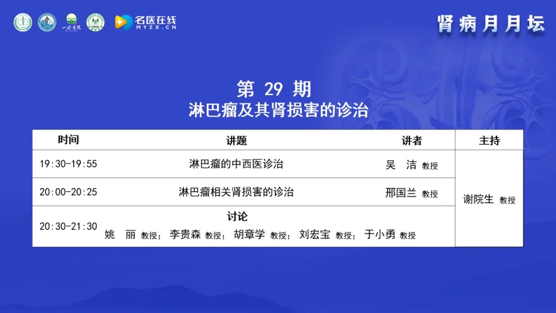 今天的主題是淋巴瘤及其腎損害的診治,很榮幸邀請到了在該領(lǐng)域有很深造詣的專家,包括血液病專家、臨床腎臟病專家、腎臟病理專家、中醫(yī)和西醫(yī)專家,都是一線非常有經(jīng)驗(yàn)的科主任,一起進(jìn)行學(xué)術(shù)講座、點(diǎn)評與討論。