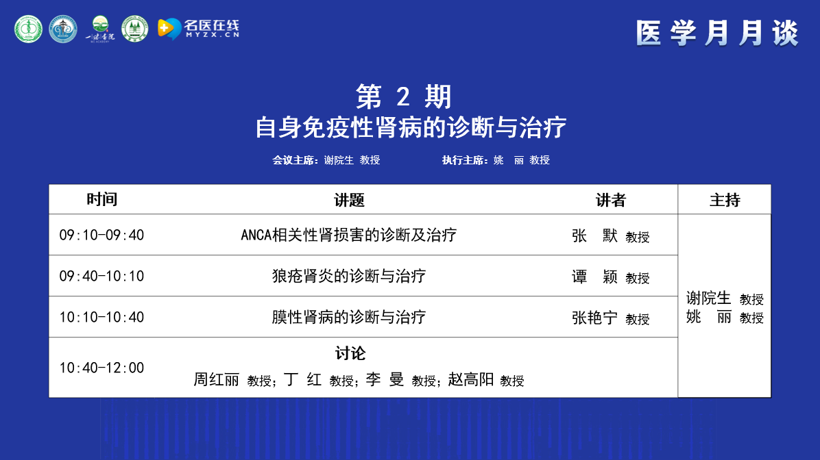 謝教授簡單介紹了“醫學月月談”的前身“腎病月月壇”的歷史,“腎病月月壇”是在疫情防控期間開展的線上學術交流活動,以腎臟病或系統性疾病腎損害的診治為主,每期一個主題,為了讓更多的人受益,升級為“醫學月月談”。“醫學月月談”以臨床需求為導向,以解決臨床問題為目的,具有以下特色和優勢:①每月1-2次,一般在星期六上午;②線下和線上相結合,線下在全國主要城市輪流舉辦,線上直播,會后回放;③每期一個主題,設立專題執行主席,與會議主席一起主持“醫學月月談”;④講座、病例分享與點評討論相結合;⑤多學科交叉融合,涉及腎內科、風濕免疫科、神經內科、檢驗科、皮膚科、呼吸科、腫瘤科等多學科的學術交流;⑥突出西醫和中醫相結合、臨床和檢驗/病理相結合、精準診斷和有效治療相結合,為醫患提供更全面的學術支持。