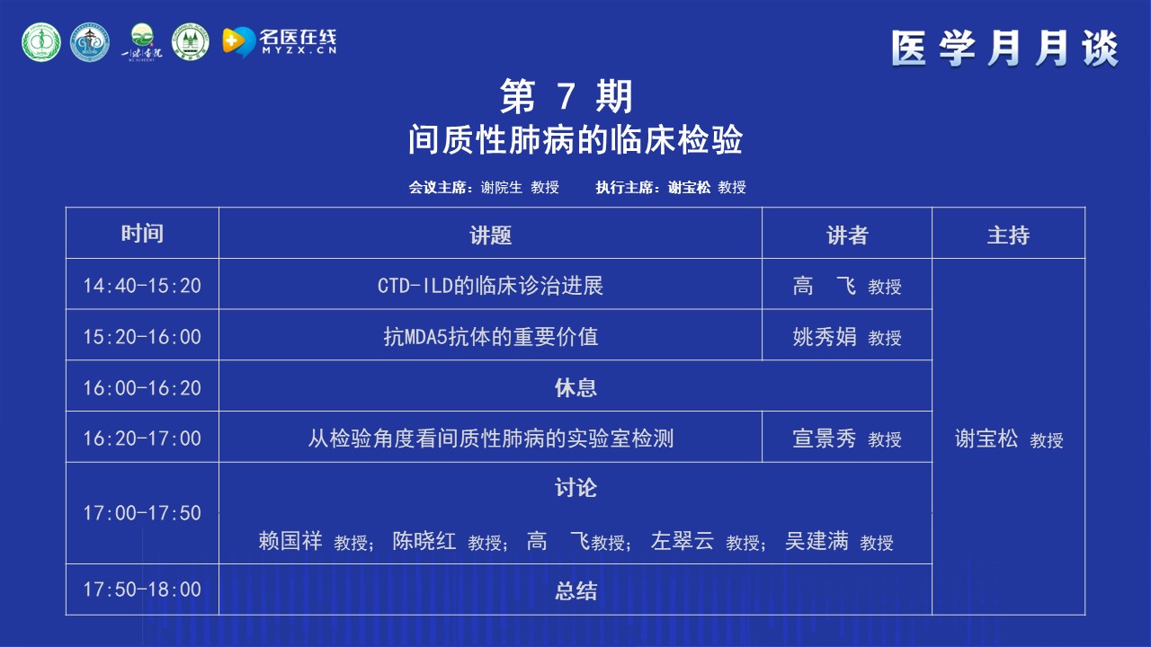 謝教授簡單介紹了“醫(yī)學(xué)月月談”的前身“腎病月月壇”的歷史,“腎病月月壇”是在疫情防控期間開展的線上學(xué)術(shù)交流活動,以腎臟病或系統(tǒng)性疾病腎損害的診治為主,每期一個主題,形式和內(nèi)容都很受歡迎。為了讓更多的人受益,升級為“醫(yī)學(xué)月月談”。“醫(yī)學(xué)月月談”是一個以臨床需求為導(dǎo)向,以解決臨床問題為目的,線下和線上相結(jié)合的醫(yī)學(xué)交流活動。本期醫(yī)學(xué)月月談的主題是間質(zhì)性肺病的臨床檢驗(yàn),非常榮幸的邀請到在間質(zhì)性肺病領(lǐng)域非常著名的謝寶松教授作為本期的執(zhí)行主席,相信本期月月談將在謝教授的引導(dǎo)下,在各位專家們的大力支持下,取得圓滿成功。